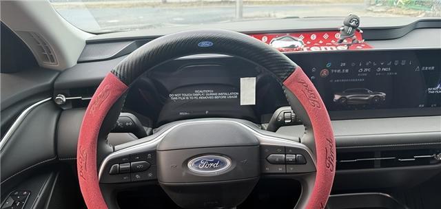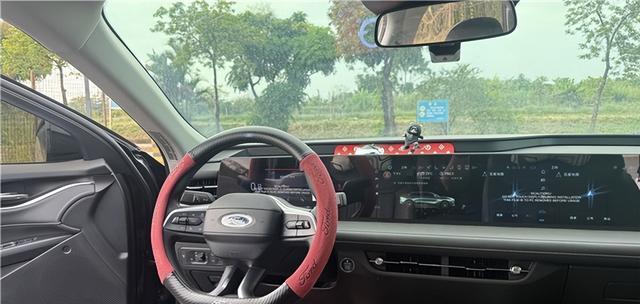 27英寸的大联屏看起来很有科技感,操作流畅度还算高,内置的车机系统支持语音控制,平时开车时,说一句 “你好,福特,打开空调”“你好,福特,导航到XX商场”,系统都能快速响应,而且识别准确率很高,不用手动操作,既方便又安全。还有全速自适应巡航功能,走高速时开启后,车辆能自动跟车,保持安全距离,还能自动调整车速,大大减轻了驾驶疲劳。